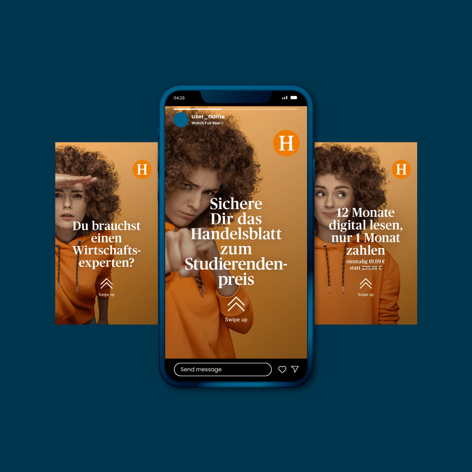 Handelsblatt — Student Campaign on Instagram Stories Year: 2021 Context: Digital campaign for Handelsblatt targeting students. Market research had shown untapped potential in this audience, particularly through Instagram Stories rather than traditional digital advertising formats. My role: Creative Director. I led the creative direction of the campaign, defining the visual and narrative framework and guiding execution across formats. Project type: Digital campaign · Social media advertising · Creative direction